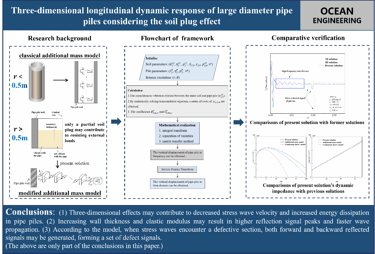 (通讯员 张云鹏) 随着海洋强国建设的深入推进,大型海洋工程设施对高性能桩基的设计与安全评估提出了更高要求。近日,我院勘察与基础工程系在创新型人才培养方面取得重要突破,由张云鹏特任教授指导的本科生王明以第一作者身份,在海洋工程领域国际top期刊《Ocean Engineering》上发表了题为“Three-dimensional longitudinal dynamic response of large diameter pipe piles considering the soil plug effect”的研究论文。张云鹏特任教授为论文的通讯作者,此项成果标志着勘察与基础工程系在课堂教学衍生、打造创新课堂方面进入了新阶段。